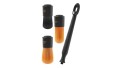 Zestaw zawierający trzy wymienne końcówki pędzla o różnych stopniach miękkości oraz odkręcaną rączkę. Przeznaczony jest do czyszczenia detali, szczelin lub trudniejszych do usunięcia zabrudzeń znajdujących się na delikatnych powierzchniach. W każdej końcówce włosie jest gęsto nabite, bardzo wytrzymałe, odporne na działanie chemii, jego końcówki są odporne na degradację. Wypustki na końcówkach zapobiegają spadaniu z pochyłej powierzchni. Uniwersalna rączka wykonana z wysokiej jakości tworzywa sztucznego, powleczona jest antypoślizgową warstwą gumy, dodatkowo wyposażona została w magnes umożliwiający przytwierdzenie do metalowej powierzchni. Dzięki kompaktowym gabarytom i praktycznemu opakowaniu zestaw jest idealny do pracy w studiu detailingowym lub jako praktyczny gadżet w aucie. Długości włosia: czarny 4 cm, pomarańczowy 5 cm, pomarańczowo-biały 5 cm. Długość rączki: 16 cm