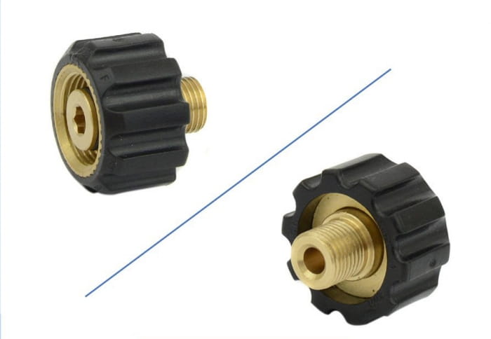 Mosiężny adapter umożliwiający podłączenie pianownicy P.A. do pistoletów myjek ciśnieniowych firmy Kärcher, modele serii HD/HDS.