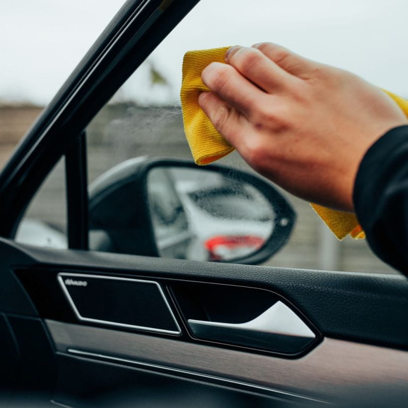 - Aplikować punktowo, przykładając mikrofibrę do powierzchni szyby, pozostawiając widoczne. ślady.