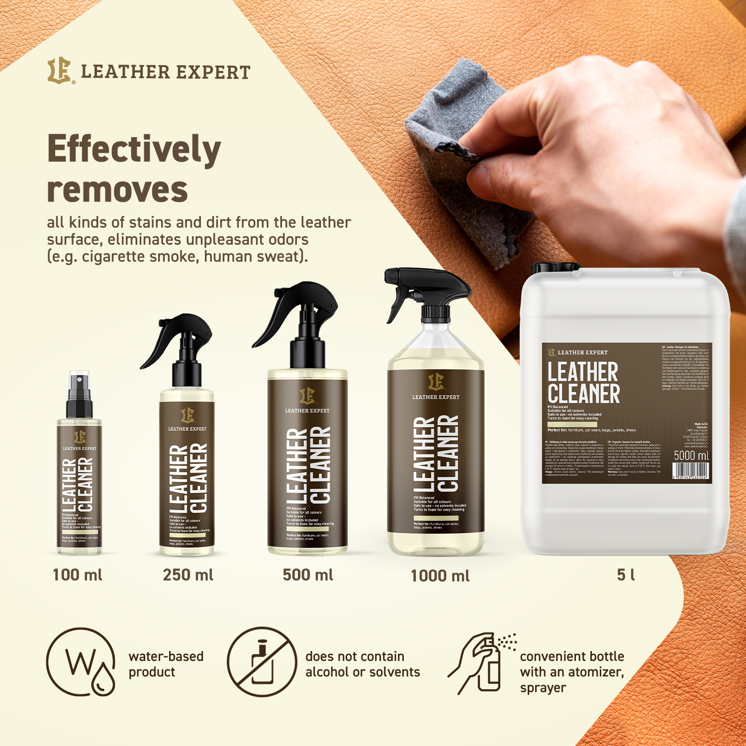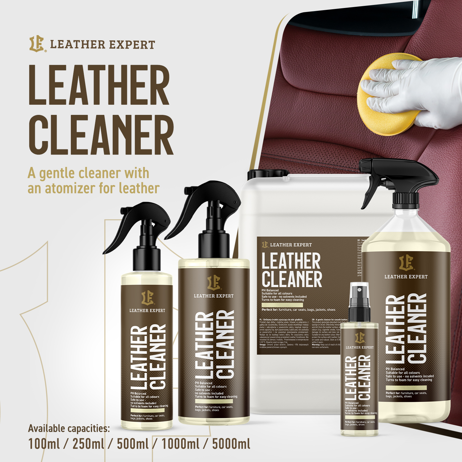 Leather Expert Cleaner znajduje zastosowanie przy czyszczeniu różnego rodzaju skór gładkich w samochodach, meblach skórzanych, galanterii i torebkach. Leather Expert Cleaner tworzy obfitą i stabilną pianę przyczyniając się do rewelacyjnych efektów podczas czyszczenia. Produkt jest bezpieczny dla środowiska, ekologiczny, biodegradowalny a także nie testowany na zwierzętach. Środek Leather Expert Cleaner cechują również właściwości antystatyczne. Oznacza to, że po użyciu produktu kurz nie osiada na skórze.