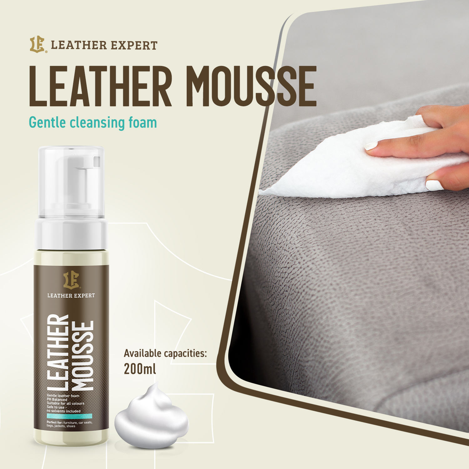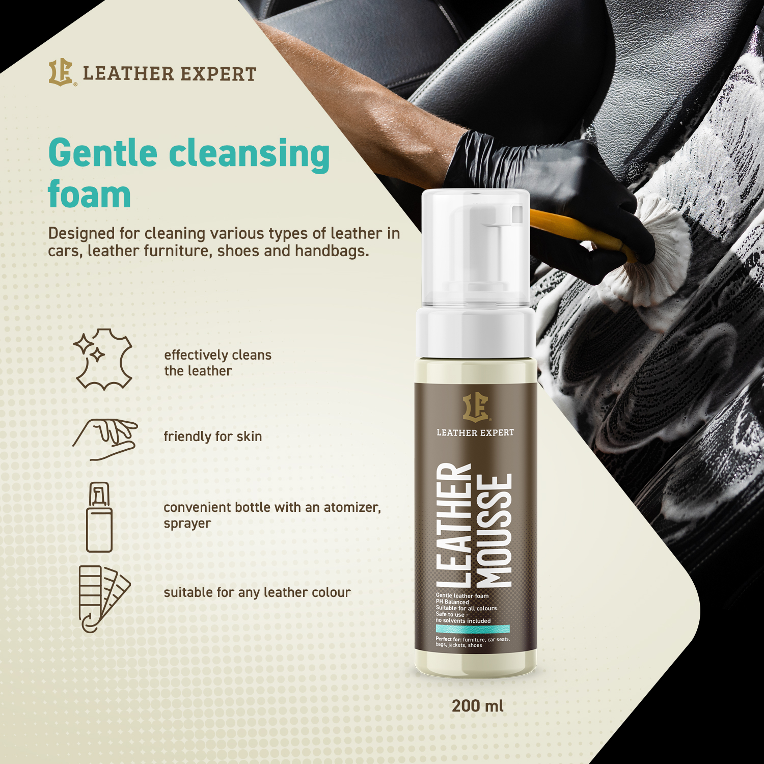 Leather Expert Mousse znajduje zastosowanie przy czyszczeniu różnego rodzaju skór gładkich w samochodach, meblach skórzanych, galanterii i torebkach. Leather Expert Mousse dzięki specjalnemu aplikatorowi tworzy obfitą i stabilną pianę przyczyniając się do rewelacyjnych efektów podczas czyszczenia. Produkt jest bezpieczny dla środowiska, ekologiczny, biodegradowalny a także nie testowany na zwierzętach. Środek Leather Expert Mousse cechują również właściwości antystatyczne. Oznacza to, że po użyciu produktu kurz nie osiada na skórze. Nie stosować do zamszu i nubuku.