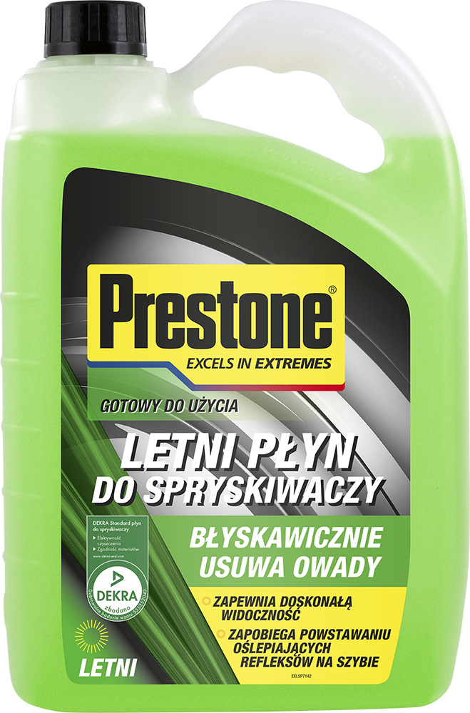 Nowy, gotowy do użycia płyn letni Prestone zapewnia doskonałą widoczność w każdych warunkach. Jego formuła doskonale usuwa ciężkie zabrudzenia, takie jak pozostałości po owadach oraz zapobiega powstawaniu oślepiających refleksów na szybie.