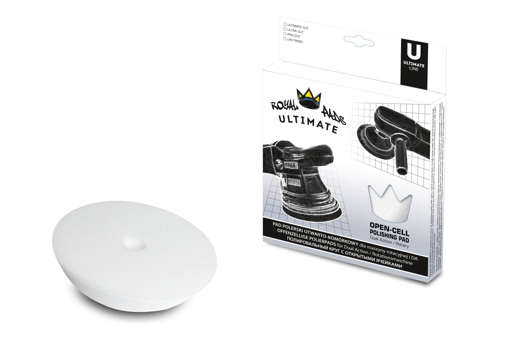 Royal ULTIMATE Cut - Bardzo agresywny pad polerski o budowie otwarto-komórkowej, przeznaczony do „wycinania” bardzo głębokich zarysowań na lakierze. Produkt został sklasyfikowany jako trzeci, najbardziej agresywny stopień siły cięcia w najnowszej lini ULTIMATE.