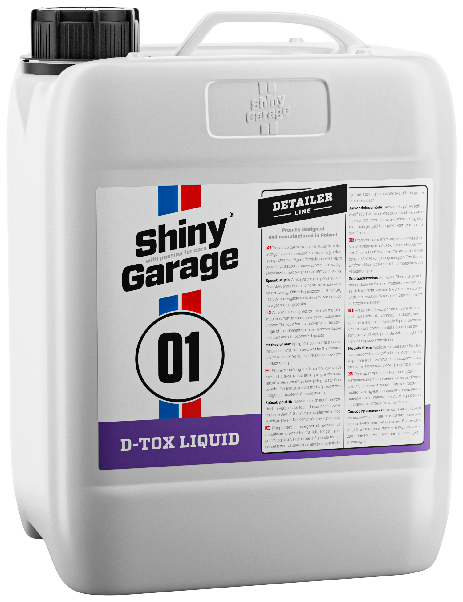 Shiny Garage D-Tox Liquid to produkt, usuwający metaliczne zanieczyszczenia. Bez trudu usuwa wżarte cząsteczki rdzy i metalu z powierzchni malowanych, szkła, gumy i chromu. Idealny do wstępnego oczyszczenia lakieru czy felg. Podczas aplikacji zachodzi reakcja w wyniku, której produkt zaczyna "krwawić". Nie obawiamy się stwierdzenia, że jest to najlepszy tego typu preparat na rynku.