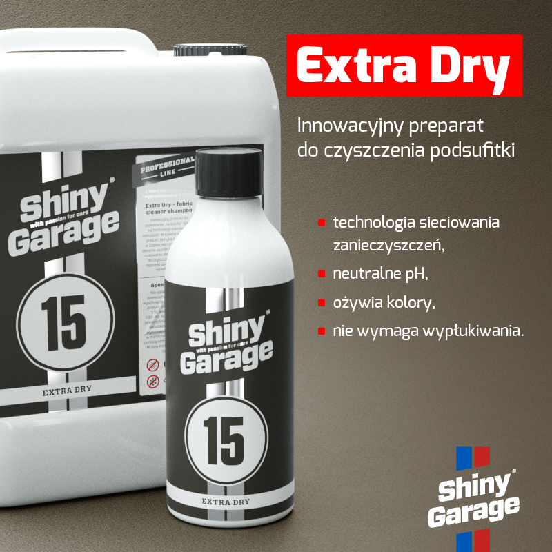 Extra Dry Fabric Cleaner Shampoo to innowacyjny produkt przeznaczony do czyszczenia podsufitki, boczków drzwiowych i wszelkich elementów materiałowych wrażliwych na przemoczenie. Produkt nie wymaga stosowania wody w celu wypłukania co gwarantuje bezpieczną pracę bez ryzyka odklejenie się czyszczonego materiału.