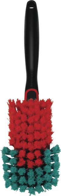 Rączka wykonana z czarnego polipropylenu, a miękkie i gęste włosie z rozszczepionego na końcach zielonego i czerwonego poliestrowego nylonu odpornego na działanie środków do mycia felg, nie posiada ostrych krawędzi(całość zalana gumą), bezpieczna dla felg aluminiowych (końcówki włosia rozdwajane).